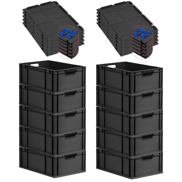 PROREGAL SparSet 10x Eurobox NextGen Grip mit Auflagedeckel inkl. 4 blauen Schiebeschnappverschlüssen, HxBxT 22x40x60cm, 44 Liter, Schwarz, Griffe offen, Verstärkter Boden, Eurobehälter, Transportbox, Transportbehälter, Stapelbehälter