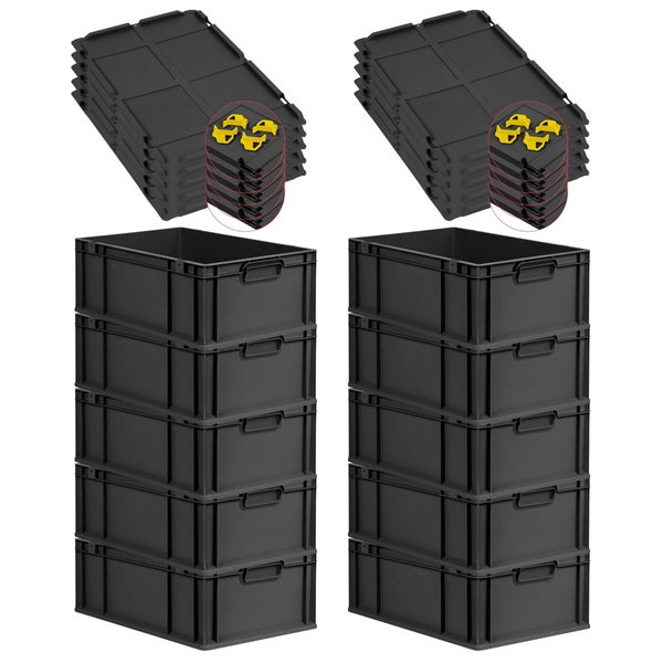 PROREGAL SparSet 10x Eurobox NextGen Grip mit Auflagedeckel inkl. 4 gelben Schiebeschnappverschlüssen, HxBxT 22x40x60cm, 44 Liter, Schwarz, Griffe geschlossen, Verstärkter Boden, Eurobehälter, Transportbox, Transportbehälter, Stapelbehälter