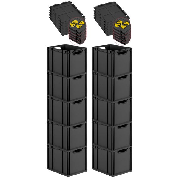 PROREGAL SparSet 10x Eurobox NextGen Grip mit Auflagedeckel inkl. 4 gelben Schiebeschnappverschlüssen, HxBxT 32x30x40cm, 30 Liter, Schwarz, Griffe offen, Eurobehälter, Transportbox, Transportbehälter, Stapelbehälter