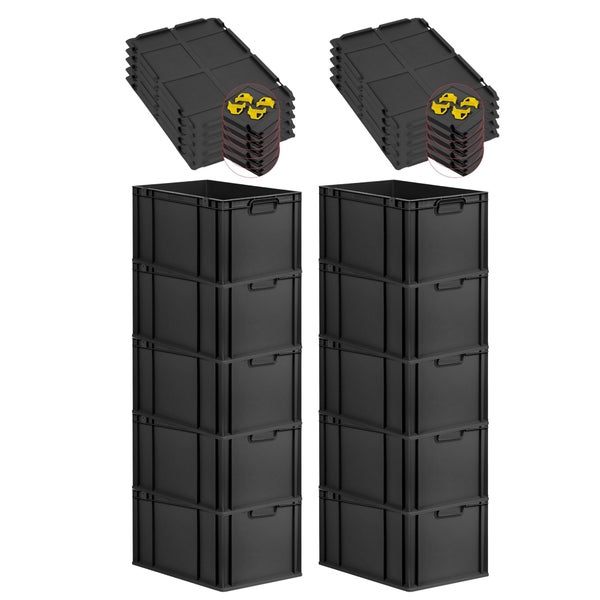 PROREGAL SparSet 10x Eurobox NextGen Grip mit Auflagedeckel inkl. 4 gelben Schiebeschnappverschlüssen, HxBxT 32x40x60cm, 65 Liter, Schwarz, Griffe geschlossen, Verstärkter Boden, Eurobehälter, Transportbox, Transportbehälter, Stapelbehälter