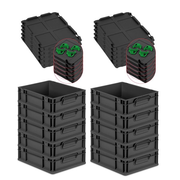 PROREGAL SparSet 10x Eurobox NextGen Grip mit Auflagedeckel inkl. 4 grünen Schiebeschnappverschlüssen, HxBxT 12x30x40cm, 11 Liter, Schwarz, Griffe geschlossen, Eurobehälter, Transportbox, Transportbehälter, Stapelbehälter