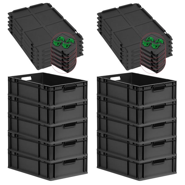 PROREGAL SparSet 10x Eurobox NextGen Grip mit Auflagedeckel inkl. 4 grünen Schiebeschnappverschlüssen, HxBxT 17x40x60cm, 34 Liter, Schwarz, Griffe offen, Eurobehälter, Transportbox, Transportbehälter, Stapelbehälter