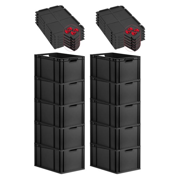 PROREGAL SparSet 10x Eurobox NextGen Grip mit Auflagedeckel inkl. 4 roten Schiebeschnappverschlüssen, HxBxT 32x40x60cm, 65 Liter, Schwarz, Griffe offen, Verstärkter Boden, Eurobehälter, Transportbox, Transportbehälter, Stapelbehälter