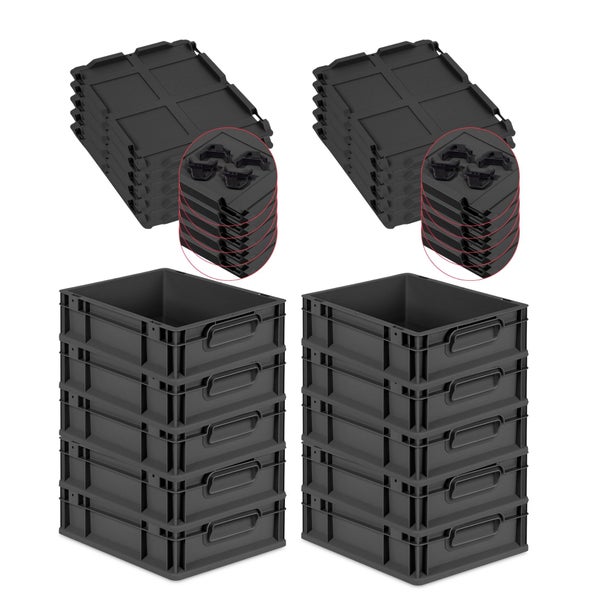 PROREGAL SparSet 10x Eurobox NextGen Grip mit Auflagedeckel inkl. 4 schwarzen Schiebeschnappverschlüssen, HxBxT 12x30x40cm, 11 Liter, Schwarz, Griffe geschlossen, Eurobehälter, Transportbox, Transportbehälter, Stapelbehälter