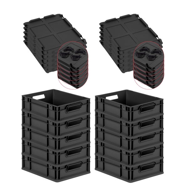 PROREGAL SparSet 10x Eurobox NextGen Grip mit Auflagedeckel inkl. 4 schwarzen Schiebeschnappverschlüssen, HxBxT 12x30x40cm, 11 Liter, Schwarz, Griffe offen, Eurobehälter, Transportbox, Transportbehälter, Stapelbehälter