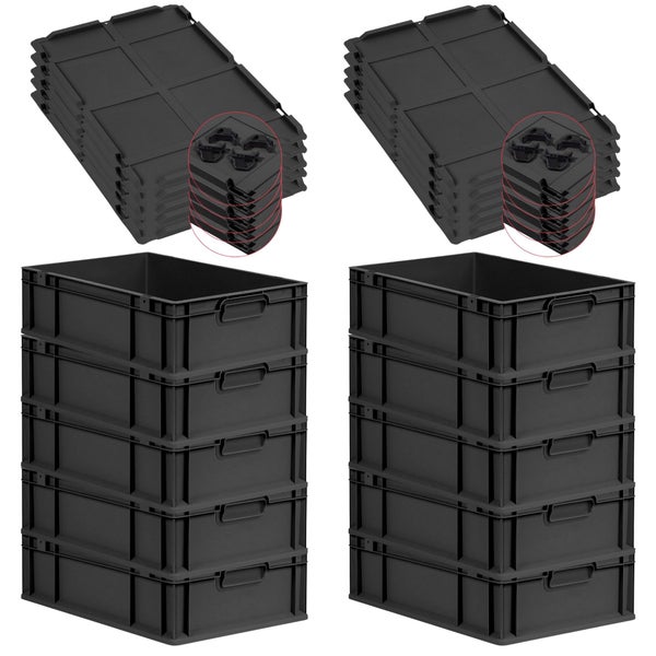 PROREGAL SparSet 10x Eurobox NextGen Grip mit Auflagedeckel inkl. 4 schwarzen Schiebeschnappverschlüssen, HxBxT 17x40x60cm, 34 Liter, Schwarz, Griffe geschlossen, Eurobehälter, Transportbox, Transportbehälter, Stapelbehälter