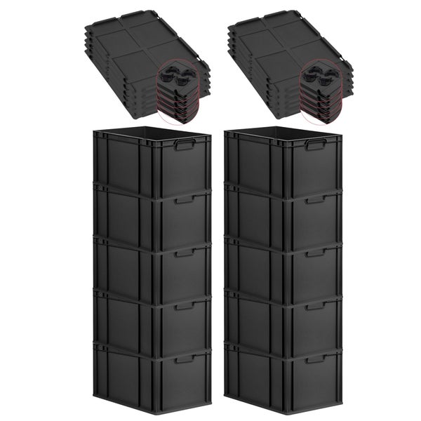 PROREGAL SparSet 10x Eurobox NextGen Grip mit Auflagedeckel inkl. 4 schwarzen Schiebeschnappverschlüssen, HxBxT 32x40x60cm, 65 Liter, Schwarz, Griffe geschlossen, Verstärkter Boden, Eurobehälter, Transportbox, Transportbehälter, Stapelbehälter