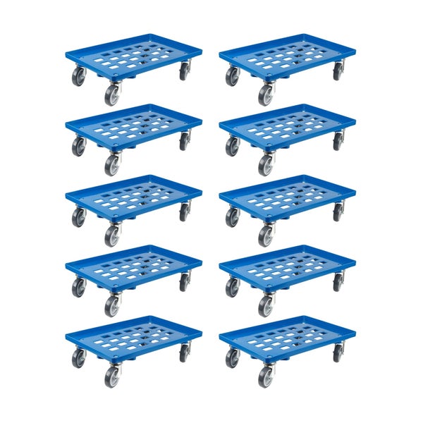 PROREGAL SparSet 10x Transportroller für Euroboxen 60 x 40 cm mit Gummiräder Blau Gitter/Rasterdeck 2 Lenkrollen und 2 Bockrollen Traglast 300 kg