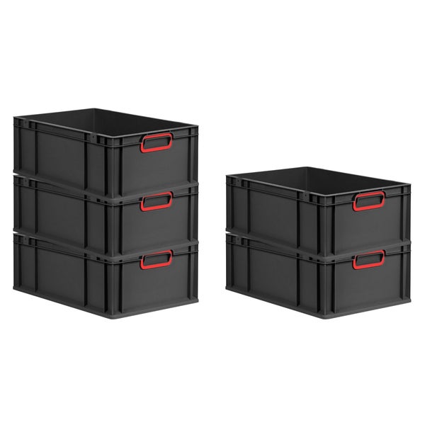 PROREGAL SparSet 5x Eurobox NextGen Color, HxBxT 22x40x60cm, 44 Liter, Griffe rot geschlossen, Verstärkter Boden, Schwarz, Eurobehälter, Transportbox, Transportbehälter, Stapelbehälter