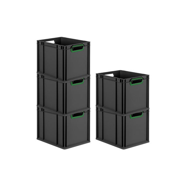 PROREGAL SparSet 5x Eurobox NextGen Color, HxBxT 32x30x40cm, 30 Liter, Griffe grün offen, Schwarz, Eurobehälter, Transportbox, Transportbehälter, Stapelbehälter