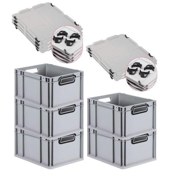 PROREGAL SparSet 5x Eurobox NextGen Color mit Auflagedeckel und Schiebeschnappverschlüsse, HxBxT 22x30x40cm, 20 Liter, Grau, Griffe schwarz offen, Eurobehälter, Transportbox, Transportbehälter, Stapelbehälter