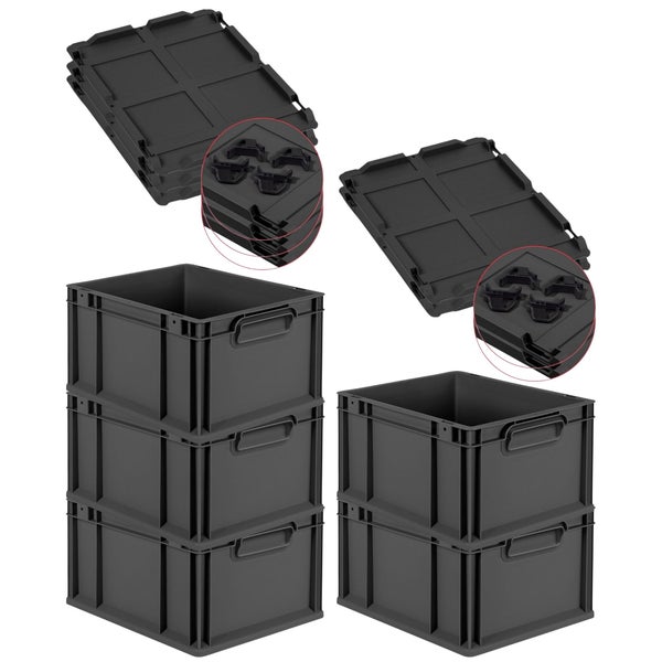 PROREGAL SparSet 5x Eurobox NextGen Color mit Auflagedeckel und Schiebeschnappverschlüsse, HxBxT 22x30x40cm, 20 Liter, Schwarz, Griffe schwarz geschlossen, Eurobehälter, Transportbox, Transportbehälter, Stapelbehälter