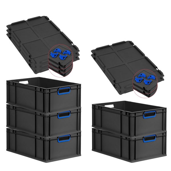 PROREGAL SparSet 5x Eurobox NextGen Color mit Auflagedeckel und Schiebeschnappverschlüsse, HxBxT 22x40x60cm, 44 Liter, Schwarz, Griffe blau offen, Verstärkter Boden, Eurobehälter, Transportbox, Transportbehälter, Stapelbehälter