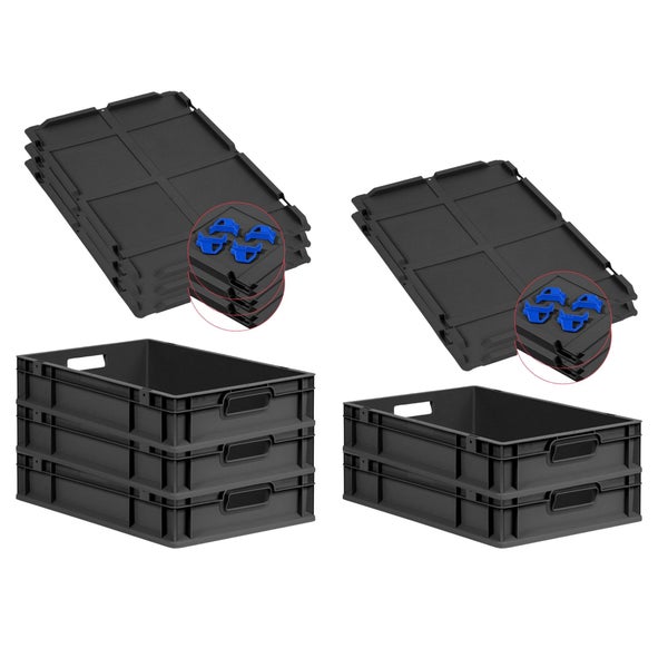 PROREGAL SparSet 5x Eurobox NextGen Grip mit Auflagedeckel inkl. 4 blauen Schiebeschnappverschlüssen, HxBxT 12x40x60cm, 23 Liter, Schwarz, Griffe offen, Eurobehälter, Transportbox, Transportbehälter, Stapelbehälter