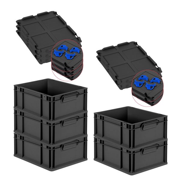 PROREGAL SparSet 5x Eurobox NextGen Grip mit Auflagedeckel inkl. 4 blauen Schiebeschnappverschlüssen, HxBxT 17x30x40cm, 16 Liter, Schwarz, Griffe geschlossen, Eurobehälter, Transportbox, Transportbehälter, Stapelbehälter