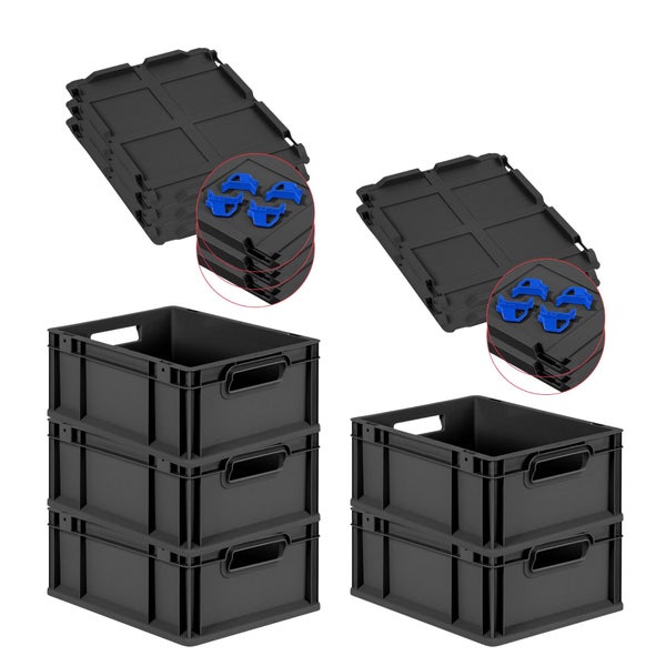 PROREGAL SparSet 5x Eurobox NextGen Grip mit Auflagedeckel inkl. 4 blauen Schiebeschnappverschlüssen, HxBxT 17x30x40cm, 16 Liter, Schwarz, Griffe offen, Eurobehälter, Transportbox, Transportbehälter, Stapelbehälter