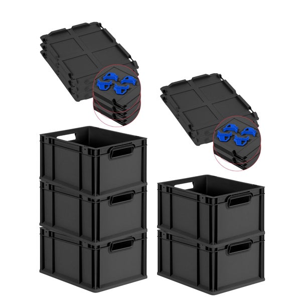 PROREGAL SparSet 5x Eurobox NextGen Grip mit Auflagedeckel inkl. 4 blauen Schiebeschnappverschlüssen, HxBxT 22x30x40cm, 20 Liter, Schwarz, Griffe offen, Eurobehälter, Transportbox, Transportbehälter, Stapelbehälter