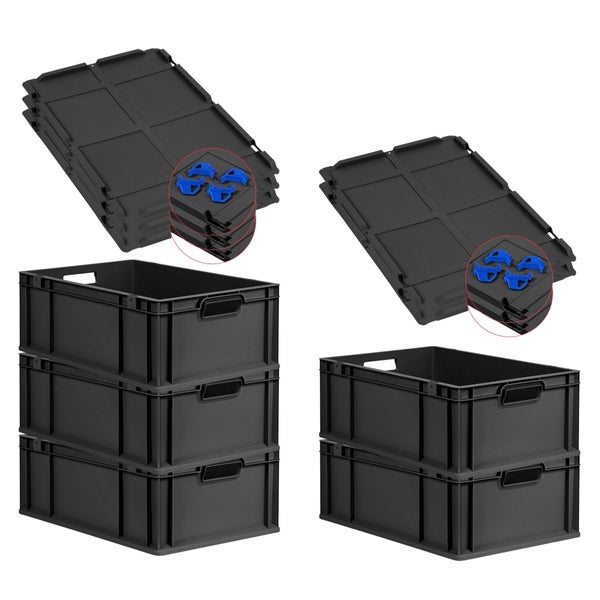 PROREGAL SparSet 5x Eurobox NextGen Grip mit Auflagedeckel inkl. 4 blauen Schiebeschnappverschlüssen, HxBxT 22x40x60cm, 44 Liter, Schwarz, Griffe offen, Verstärkter Boden, Eurobehälter, Transportbox, Transportbehälter, Stapelbehälter