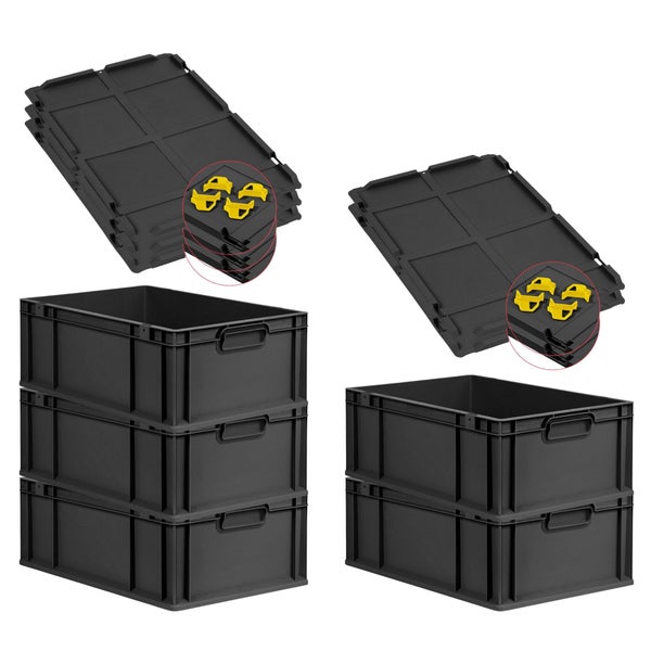 PROREGAL SparSet 5x Eurobox NextGen Grip mit Auflagedeckel inkl. 4 gelben Schiebeschnappverschlüssen, HxBxT 22x40x60cm, 44 Liter, Schwarz, Griffe geschlossen, Verstärkter Boden, Eurobehälter, Transportbox, Transportbehälter, Stapelbehälter