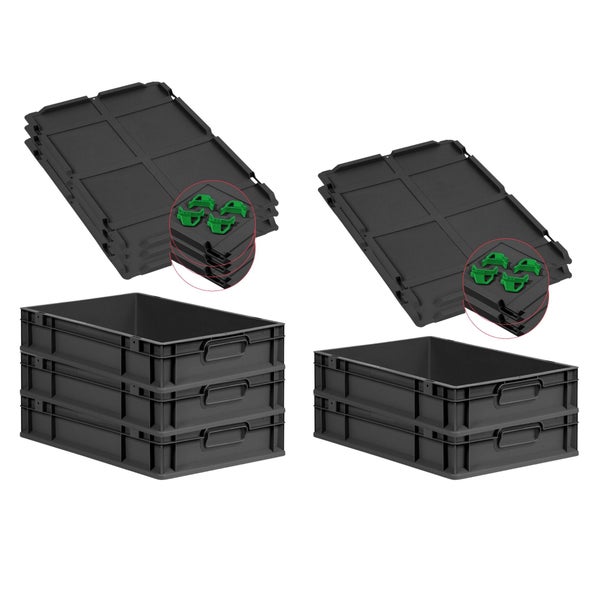 PROREGAL SparSet 5x Eurobox NextGen Grip mit Auflagedeckel inkl. 4 grünen Schiebeschnappverschlüssen, HxBxT 12x40x60cm, 23 Liter, Schwarz, Griffe geschlossen, Eurobehälter, Transportbox, Transportbehälter, Stapelbehälter