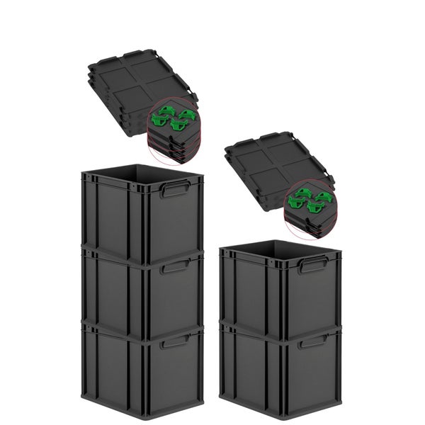 PROREGAL SparSet 5x Eurobox NextGen Grip mit Auflagedeckel inkl. 4 grünen Schiebeschnappverschlüssen, HxBxT 32x30x40cm, 30 Liter, Schwarz, Griffe geschlossen, Eurobehälter, Transportbox, Transportbehälter, Stapelbehälter