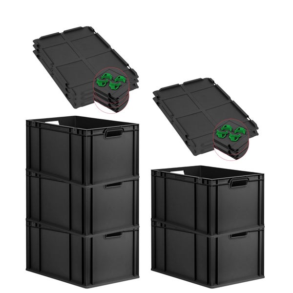 PROREGAL SparSet 5x Eurobox NextGen Grip mit Auflagedeckel inkl. 4 grünen Schiebeschnappverschlüssen, HxBxT 32x40x60cm, 65 Liter, Schwarz, Griffe offen, Verstärkter Boden, Eurobehälter, Transportbox, Transportbehälter, Stapelbehälter