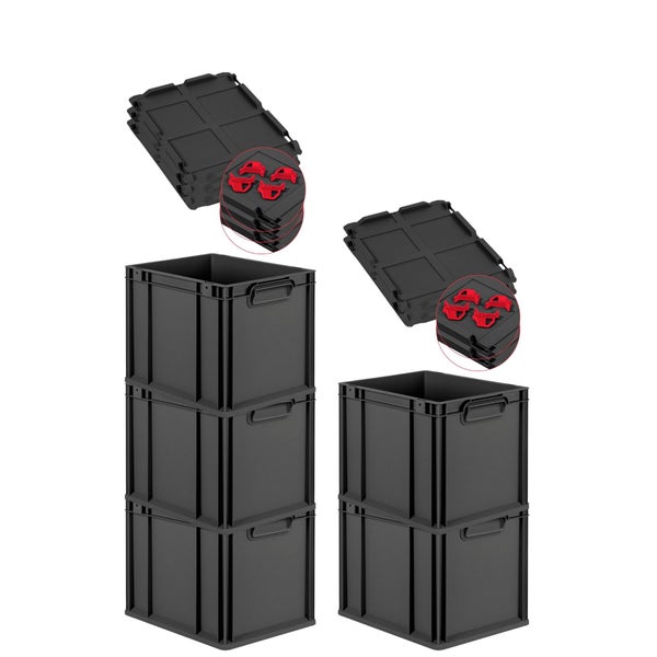 PROREGAL SparSet 5x Eurobox NextGen Grip mit Auflagedeckel inkl. 4 roten Schiebeschnappverschlüssen, HxBxT 32x30x40cm, 30 Liter, Schwarz, Griffe geschlossen, Eurobehälter, Transportbox, Transportbehälter, Stapelbehälter