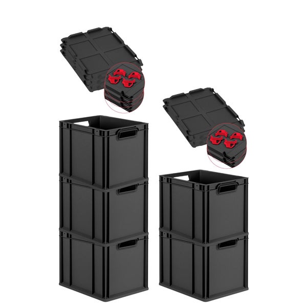 PROREGAL SparSet 5x Eurobox NextGen Grip mit Auflagedeckel inkl. 4 roten Schiebeschnappverschlüssen, HxBxT 32x30x40cm, 30 Liter, Schwarz, Griffe offen, Eurobehälter, Transportbox, Transportbehälter, Stapelbehälter