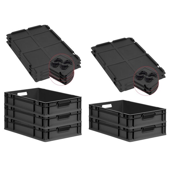 PROREGAL SparSet 5x Eurobox NextGen Grip mit Auflagedeckel inkl. 4 schwarzen Schiebeschnappverschlüssen, HxBxT 12x40x60cm, 23 Liter, Schwarz, Griffe offen, Eurobehälter, Transportbox, Transportbehälter, Stapelbehälter