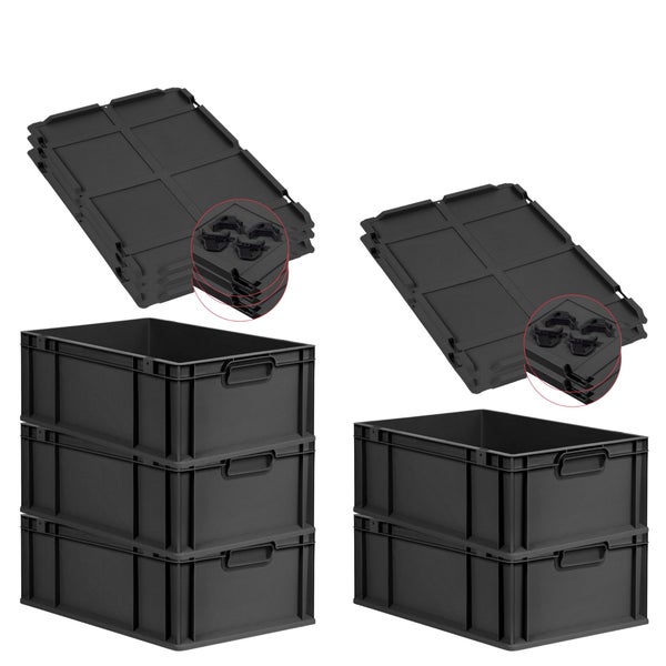 PROREGAL SparSet 5x Eurobox NextGen Grip mit Auflagedeckel inkl. 4 schwarzen Schiebeschnappverschlüssen, HxBxT 22x40x60cm, 44 Liter, Schwarz, Griffe geschlossen, Verstärkter Boden, Eurobehälter, Transportbox, Transportbehälter, Stapelbehälter