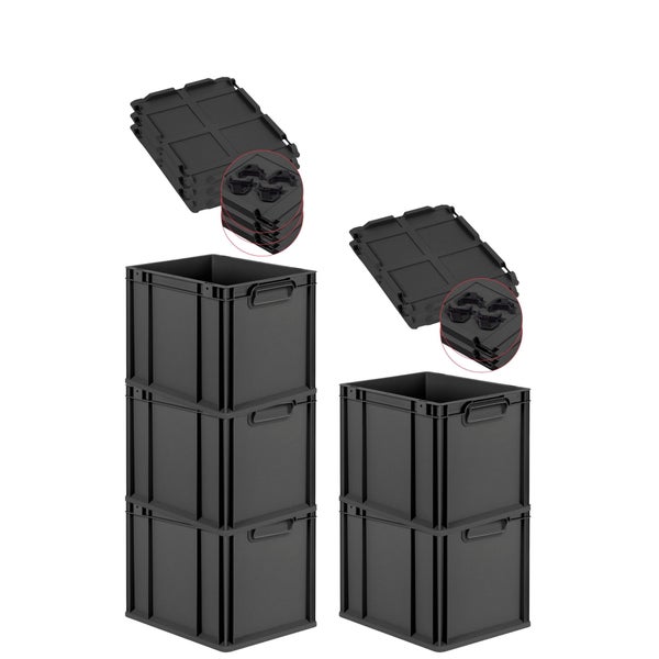PROREGAL SparSet 5x Eurobox NextGen Grip mit Auflagedeckel inkl. 4 schwarzen Schiebeschnappverschlüssen, HxBxT 32x30x40cm, 30 Liter, Schwarz, Griffe geschlossen, Eurobehälter, Transportbox, Transportbehälter, Stapelbehälter