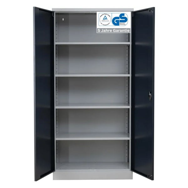 - HinweisDer Stahlschrank bietet Platz für 5 Ordnerhöhen, verfügt über 4 verstellbare Fachböden