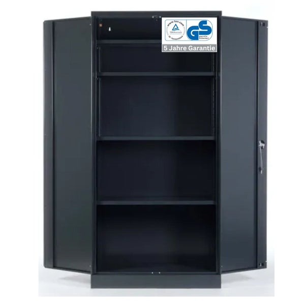 - HinweisDer Stahlschrank bietet Platz für 5 Ordnerhöhen, verfügt über 4 verstellbare Fachböden