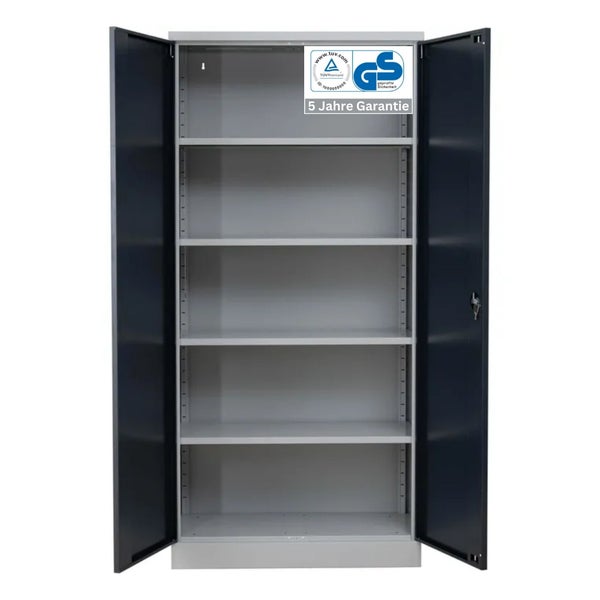 Der Stahlschrank ist komplett aus Metall gefertigt. Die Oberflächen sind aus elektrostatisch pulverbeschichtetem Metall hergestellt und dadurch besonders robust. Die fünf Fachböden sind in 5 cm Abständen in der Höhe verstellbar. Bei gleichmäßig verteilter Last, beträgt die Traglast pro Ebene 85 kg. So bietet der Metallschrank reichlich Stauraum. Der Schrank ist zusätzlich abschließbar und es werden zwei Schlüssel mitgeliefert.