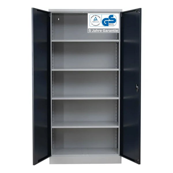 - HinweisDer Stahlschrank bietet Platz für 5 Ordnerhöhen, verfügt über 6 verstellbare Fachböden