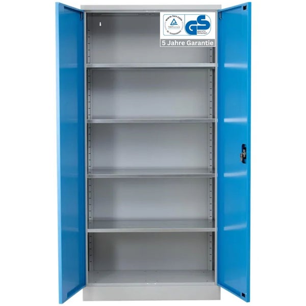 Der Stahlschrank ist komplett aus Metall gefertigt. Die Oberflächen sind aus elektrostatisch pulverbeschichtetem Metall hergestellt und dadurch besonders robust. Die acht Fachböden sind in 5 cm Abständen in der Höhe verstellbar. Bei gleichmäßig verteilter Last, beträgt die Traglast pro Ebene 85 kg. So bietet der Metallschrank reichlich Stauraum. Der Schrank ist zusätzlich abschließbar und es werden zwei Schlüssel mitgeliefert.