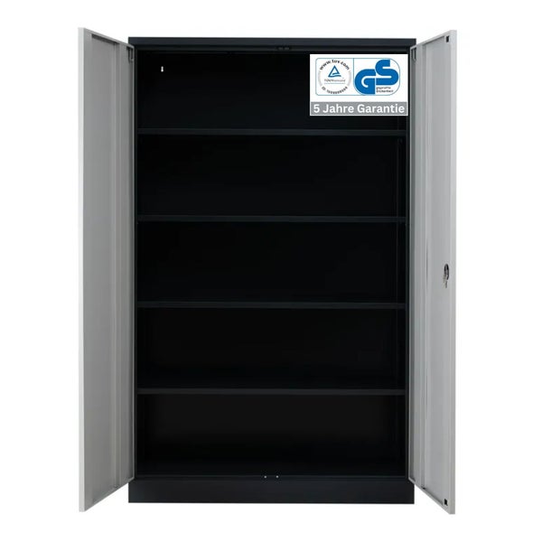 - HinweisDer Stahlschrank bietet Platz für 5 Ordnerhöhen, verfügt über 8 verstellbare Fachböden