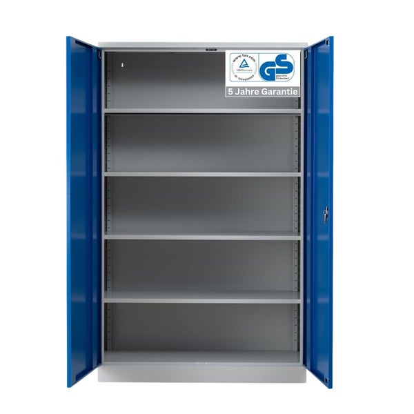 PROREGAL Stahlschrank Bee mit 8 lackierten Fachböden HxBxT 195 x 120 x 50 cm Korpusfarbe Lichtgrau Frontfarbe Enzianblau