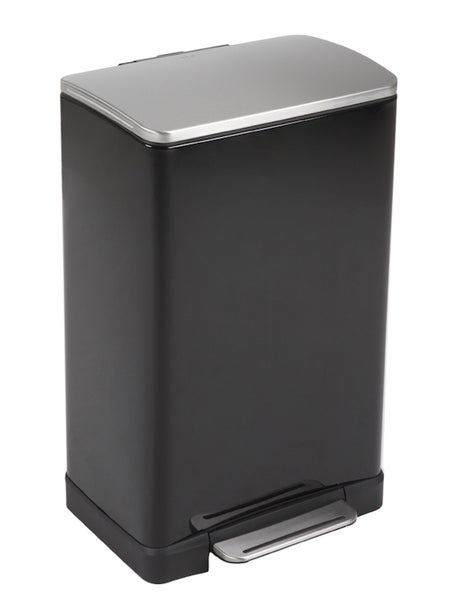 Stilvoller rechteckiger Tritt-Mülleimer mit extra Breitem Pedal, Inneneimer aus Kunststoff und dämpfendem Deckel. Die Stay-open-Funktion verriegelt den Deckel, um so den Eimer leicht reinigen und die Abfalltüte wechseln zu können.