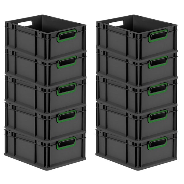 PROREGAL SuperSparSet 10x Eurobox NextGen Color, HxBxT 17x30x40cm, 16 Liter, Griffe grün offen, Schwarz, Eurobehälter, Transportbox, Transportbehälter, Stapelbehälter