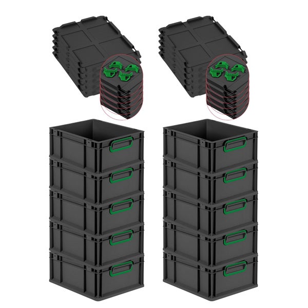 PROREGAL SuperSparSet 10x Eurobox NextGen Color mit Auflagedeckel und Schiebeschnappverschlüsse, HxBxT 17x30x40cm, 16 Liter, Schwarz, Griffe grün geschlossen, Eurobehälter, Transportbox, Transportbehälter, Stapelbehälter