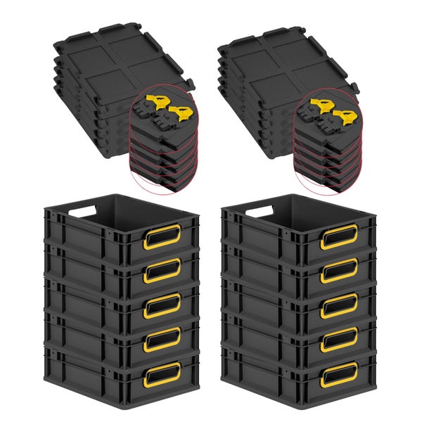 PROREGAL SuperSparSet 10x Eurobox NextGen Color mit Scharnierdeckel und Schiebeschnappverschlüssen, HxBxT 12x30x40cm, 11 Liter, Schwarz, Griffe gelb offen, Eurobehälter, Transportbox, Transportbehälter, Stapelbehälter