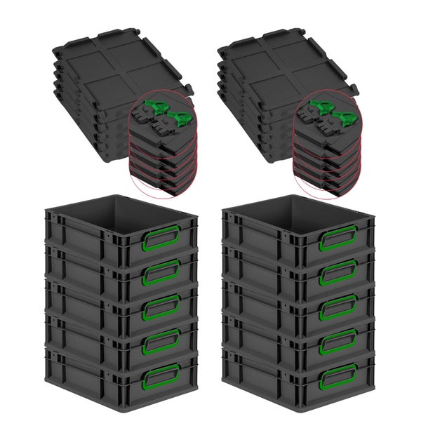 PROREGAL SuperSparSet 10x Eurobox NextGen Color mit Scharnierdeckel und Schiebeschnappverschlüssen, HxBxT 12x30x40cm, 11 Liter, Schwarz, Griffe grün geschlossen, Eurobehälter, Transportbox, Transportbehälter, Stapelbehälter