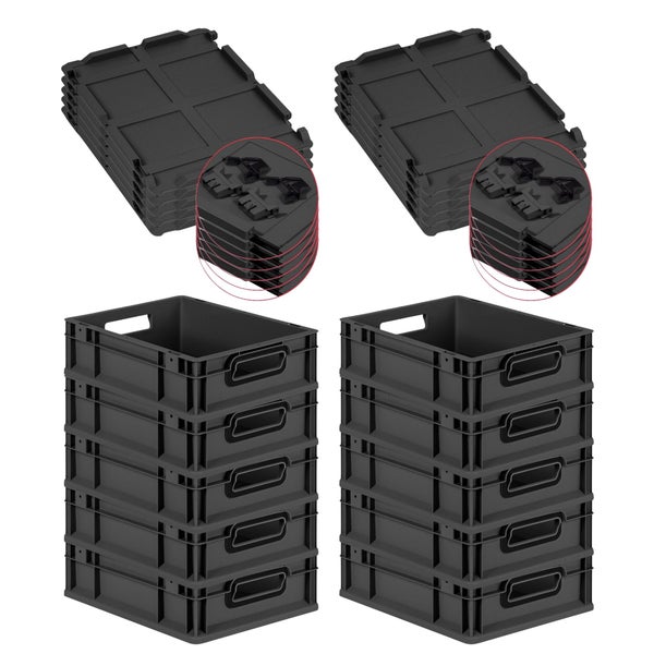 PROREGAL SuperSparSet 10x Eurobox NextGen Color mit Scharnierdeckel und Schiebeschnappverschlüssen, HxBxT 12x30x40cm, 11 Liter, Schwarz, Griffe schwarz offen, Eurobehälter, Transportbox, Transportbehälter, Stapelbehälter