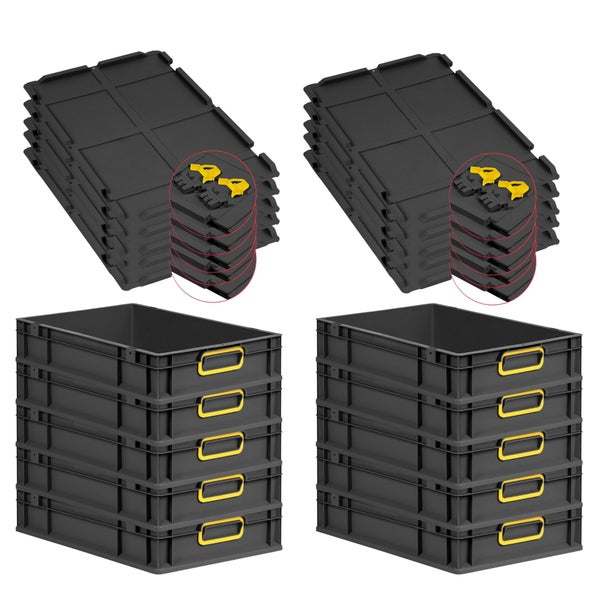 PROREGAL SuperSparSet 10x Eurobox NextGen Color mit Scharnierdeckel und Schiebeschnappverschlüssen, HxBxT 12x40x60cm, 23 Liter, Schwarz, Griffe gelb geschlossen, Eurobehälter, Transportbox, Transportbehälter, Stapelbehälter