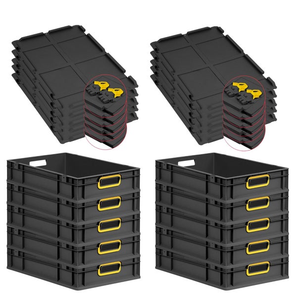 PROREGAL SuperSparSet 10x Eurobox NextGen Color mit Scharnierdeckel und Schiebeschnappverschlüssen, HxBxT 12x40x60cm, 23 Liter, Schwarz, Griffe gelb offen, Eurobehälter, Transportbox, Transportbehälter, Stapelbehälter