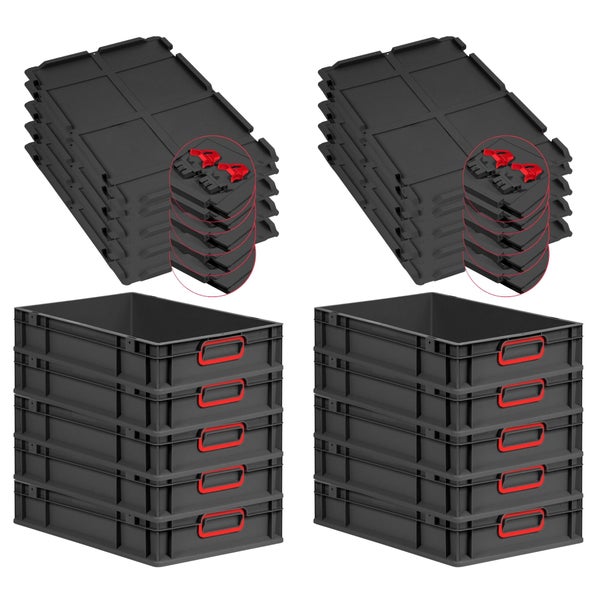 PROREGAL SuperSparSet 10x Eurobox NextGen Color mit Scharnierdeckel und Schiebeschnappverschlüssen, HxBxT 12x40x60cm, 23 Liter, Schwarz, Griffe rot geschlossen, Eurobehälter, Transportbox, Transportbehälter, Stapelbehälter