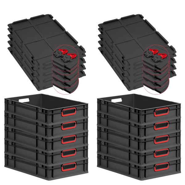 PROREGAL SuperSparSet 10x Eurobox NextGen Color mit Scharnierdeckel und Schiebeschnappverschlüssen, HxBxT 12x40x60cm, 23 Liter, Schwarz, Griffe rot offen, Eurobehälter, Transportbox, Transportbehälter, Stapelbehälter