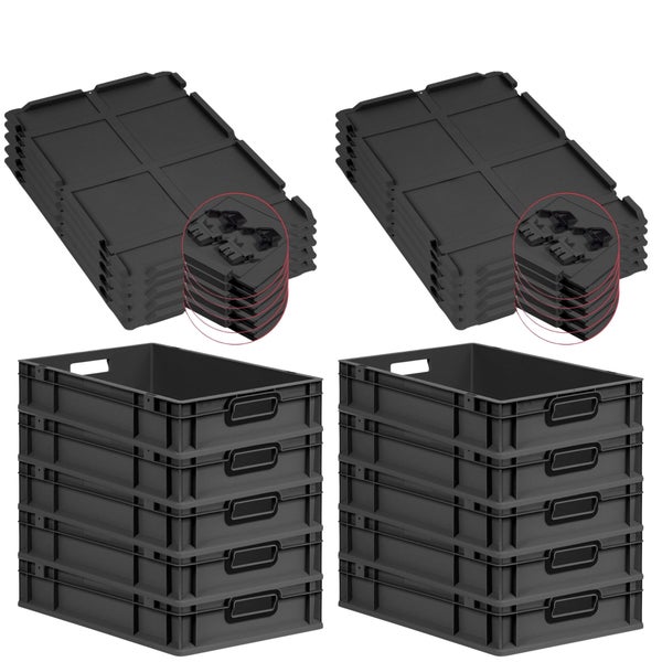 PROREGAL SuperSparSet 10x Eurobox NextGen Color mit Scharnierdeckel und Schiebeschnappverschlüssen, HxBxT 12x40x60cm, 23 Liter, Schwarz, Griffe schwarz offen, Eurobehälter, Transportbox, Transportbehälter, Stapelbehälter