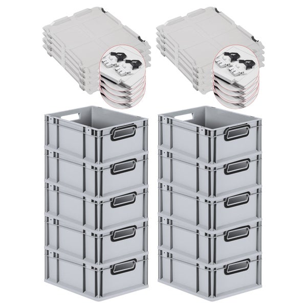 PROREGAL SuperSparSet 10x Eurobox NextGen Color mit Scharnierdeckel und Schiebeschnappverschlüssen, HxBxT 17x30x40cm, 16 Liter, Grau, Griffe schwarz offen, Eurobehälter, Transportbox, Transportbehälter, Stapelbehälter